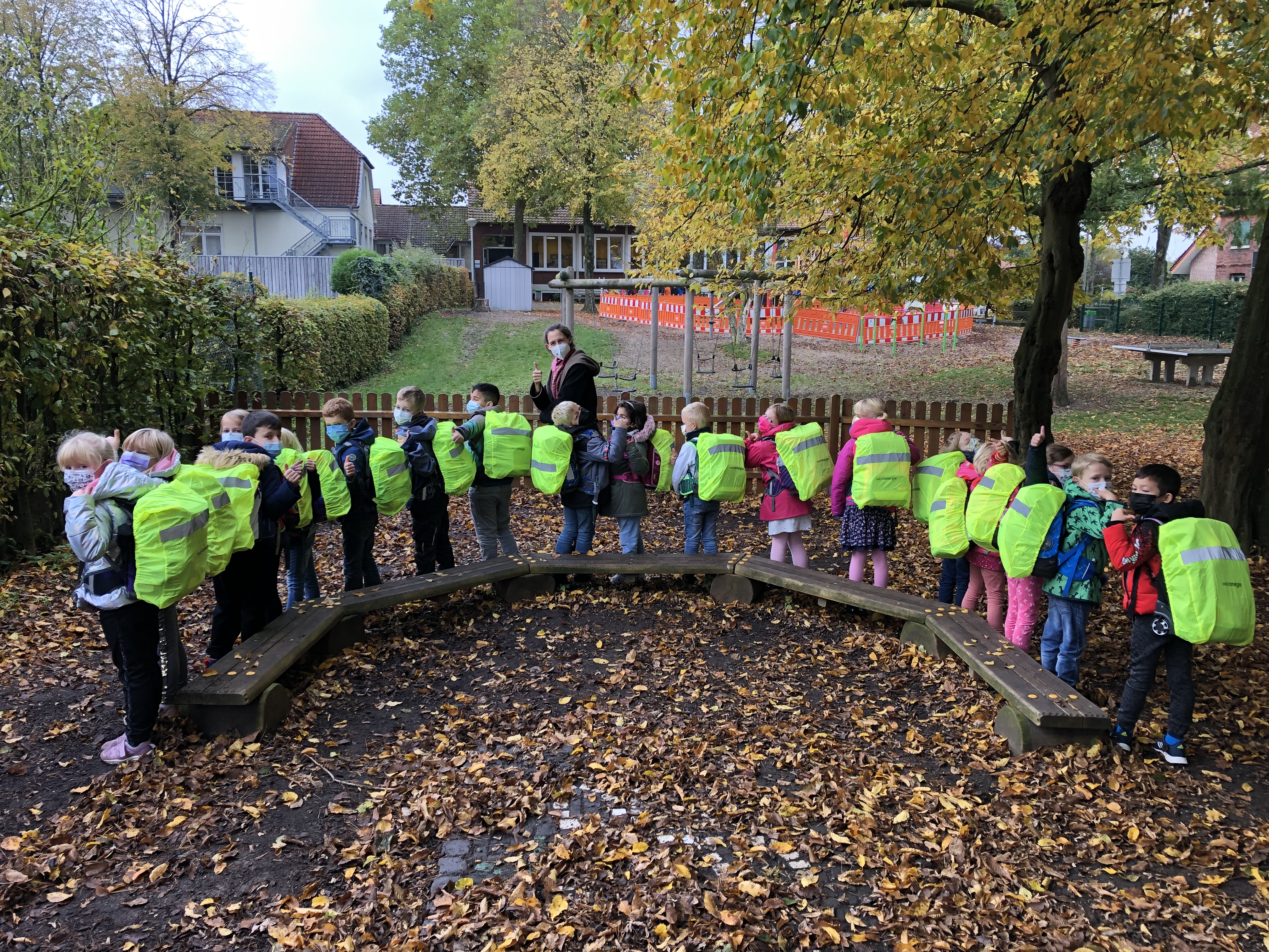Voller Stolz präsentieren unsere Erstklässler ihren neuen refelktierenden Regenschutz für ihren Schulranzen.