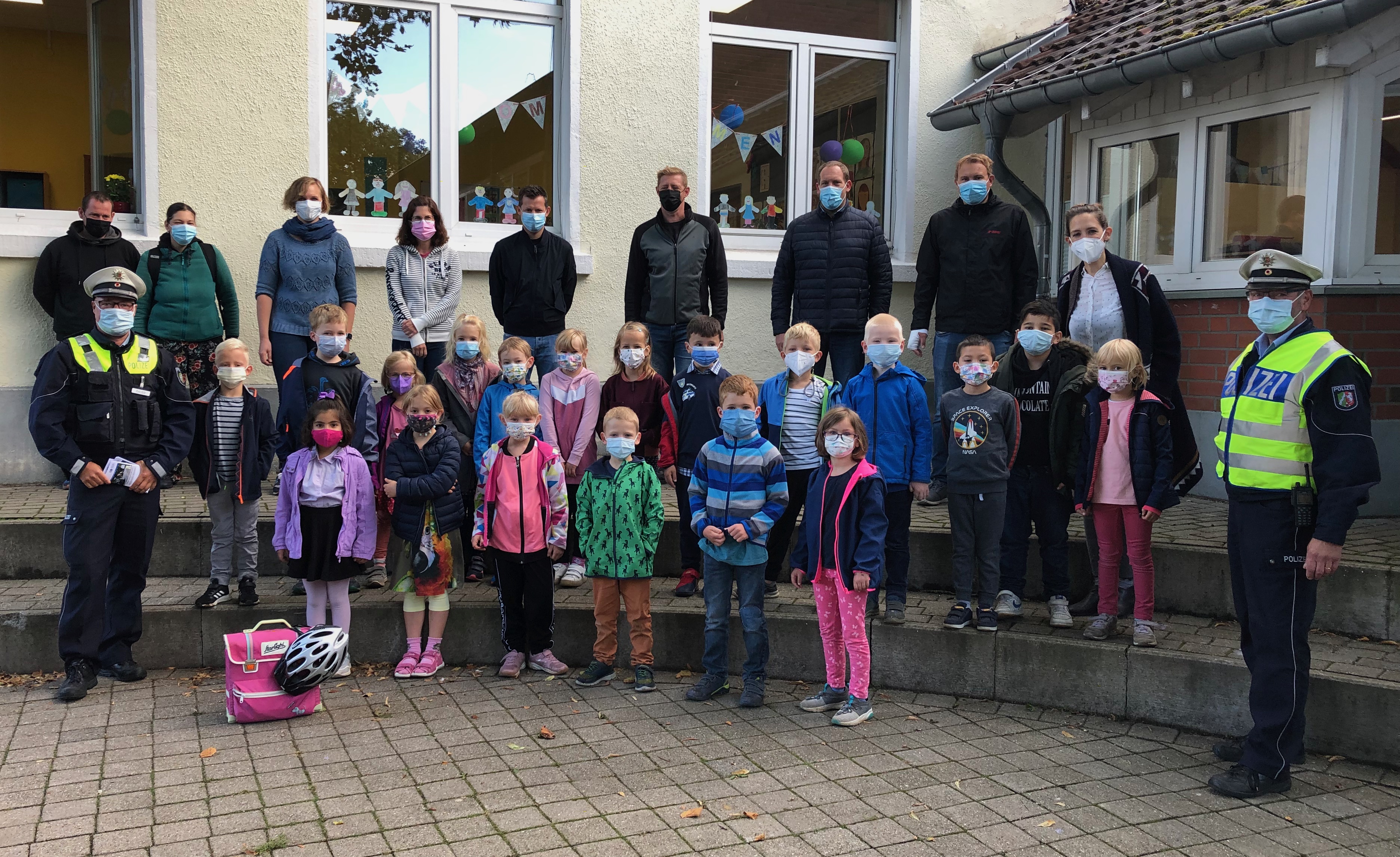 Gemeinsam mit den beiden Polizisten ging es nach einer Kurzunterweisung für die Eltern rund um die Schule. Hier wurde gemeinsam beispielsweise das sichere Überqueren der Fahrbahn geübt und die Aspekte "sehen und gesehen werden" besprochen.